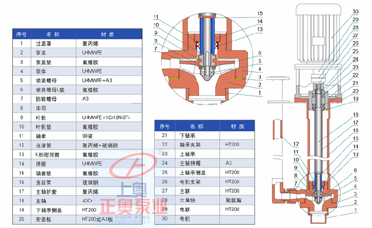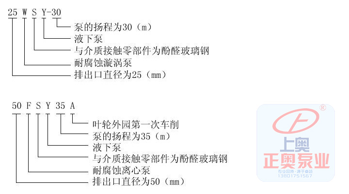正奧公司生產的WSY型、FSY型兩種型式的泵,1.WSY型泵為立式玻璃鋼液下旋渦泵。2.FSY型泵為立式玻璃鋼液下離心泵,該泵因伸入貯罐,貯槽的深度長短不同,設計液下深度800mm~3000mm之間任意選擇。只要液體高于泵體,即可不灌液而起動送液,平蓋板下設有泄漏孔,液體不會向貯罐外泄漏。本泵與介質接觸的零部件,系用聚乙烯醇縮丁醛改性酚醛玻璃纖維,經高溫模壓成型的酚醛玻璃鋼制件,聯接管、出液管采用半干法卷制工藝制成的酚醛玻璃鋼管,葉輪軸套的裝配均用酚醛膠泥和泵軸粘成一體,液下各部裝配均用酚醛膠泥粘結,伸入液下全無金屬與介質接觸,,產品具有輕質、不變形、耐溫、耐腐蝕等優良性能,在防腐方面可部分替代含鋁不銹鋼、鐵及鈦合金等貴重金屬。泵在傳動和旋轉方向:泵通過爪型彈性聯軸器由電動機直接驅動,從電動機端看泵為順時針方向旋轉。