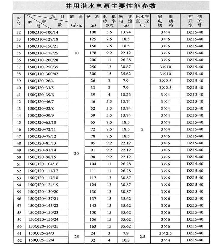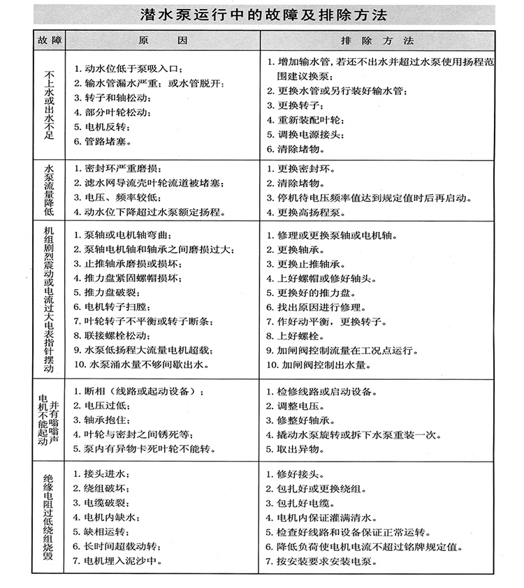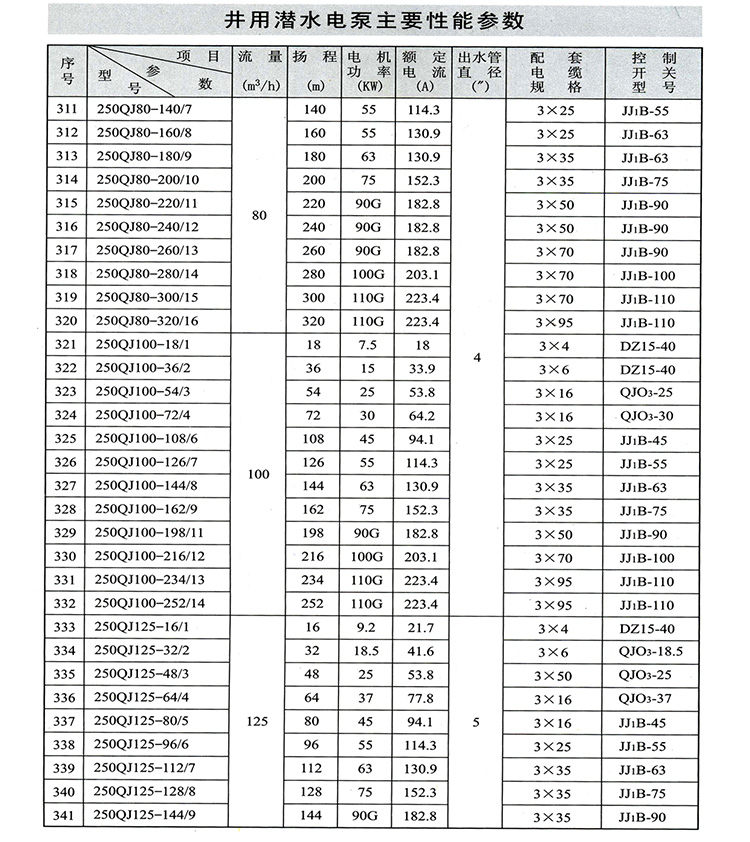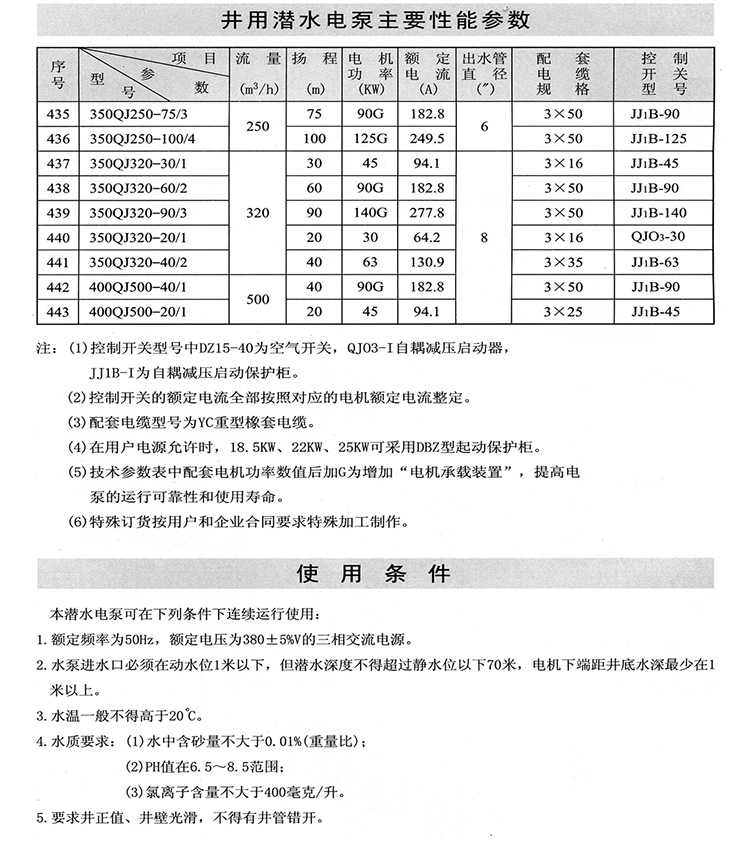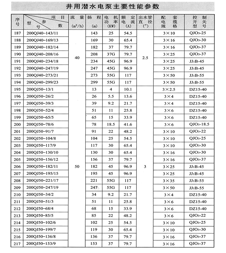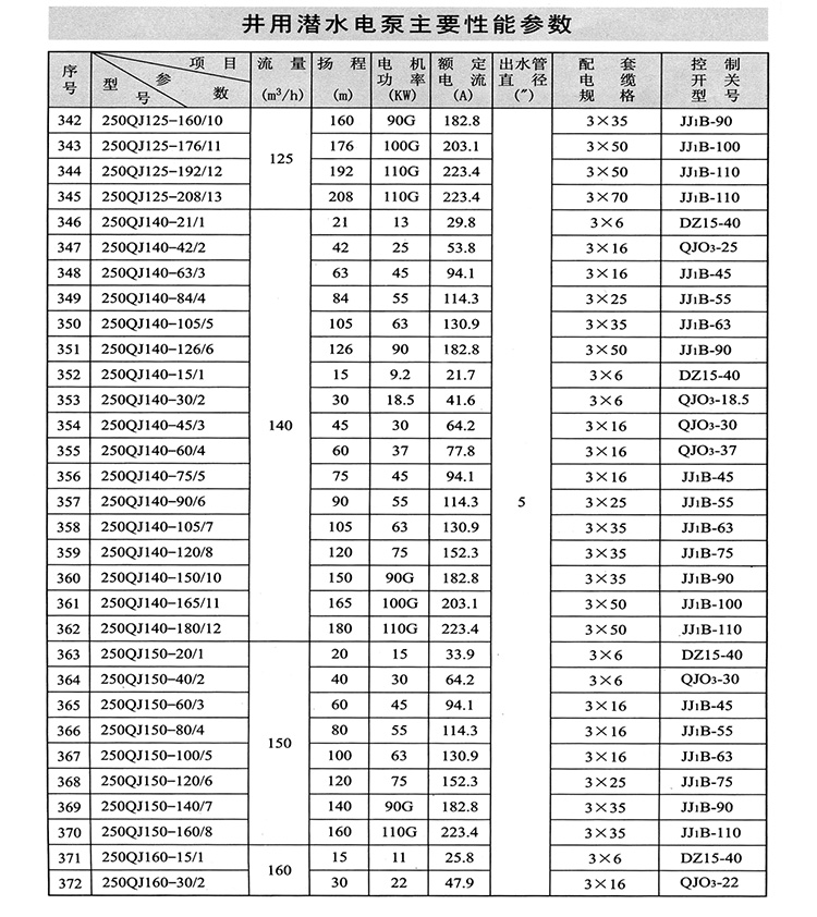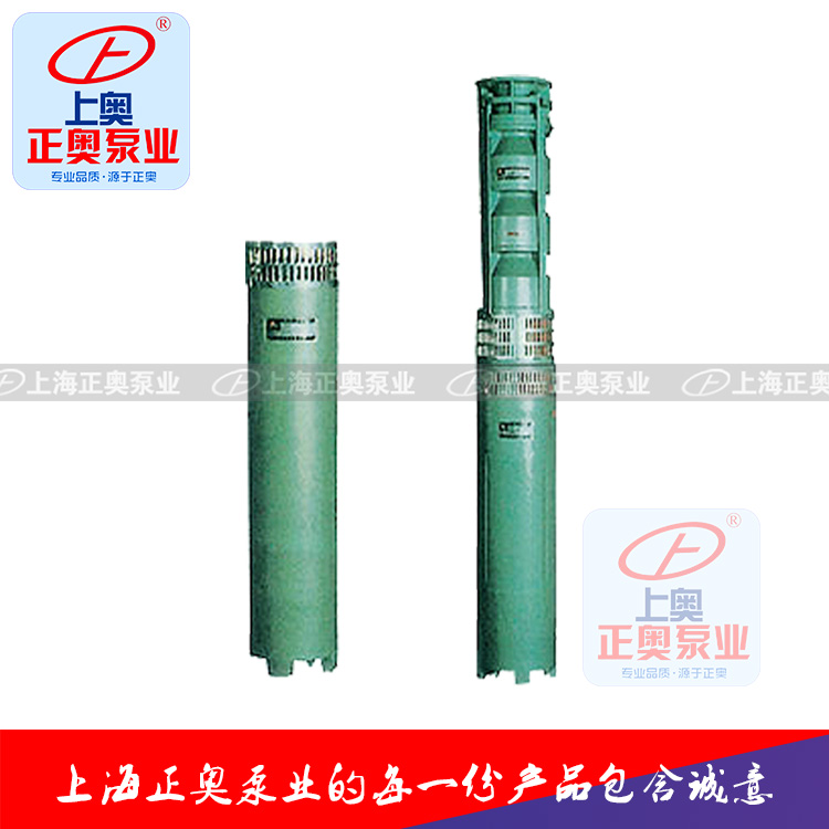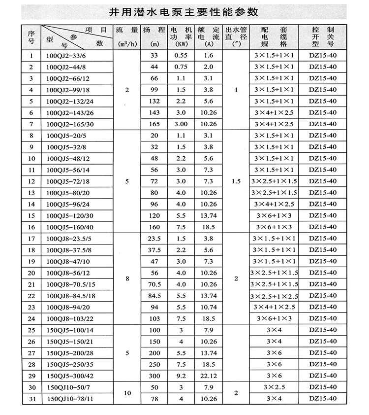 結構說明 1.QJ型潛水電泵機組由:水泵、潛水電機(包括電纜)、輸水管和控制開關四大部分組成。潛水泵為單吸多級立式離心泵:潛水電機為密閉充水濕式、立式三相鼠籠異歩電動機,電機與水泵通過爪式或中.鍵筒式聯軸器直接;配備有不同規格的三芯電纜:起動設備為不同容量等級的空氣開關和自耦減壓起動器、輸水管為不同直徑的鋼管制成,采用法蘭聯接,高揚程電泵釆用閘閥控制。 2.潛水泵每級導流殼中裝有一個橡膠軸承;葉輪用錐形套固定在泵軸上:導流殼采用嫘紋或螺栓聯成一體。 3.高揚程潛水泵上部裝有止回閥,避免停機水錘造成機組破壞。 4.潛水電機軸上部裝有迷宮式防砂器和兩個反向裝配的骨架油封,防止流砂進入電機。 5.潛水電機采用水潤滑軸承,下部裝有橡膠調壓膜、調壓彈簧,組成調壓室,調節由于溫度引起的壓力變化;電機繞組采用聚乙烯絕緣,尼龍護套耐水電磁線,電纜聯接方式按QJ型電纜接頭工藝, 把接頭絕緣脫去刮凈漆層,分別接好,焊接牢固,用生橡膠繞-層。再用防水粘膠帶纏2~3層,外面包上2〜3層防水膠布或用水膠粘結包一層橡膠帶(自行車里胎〉以防滲水。 6.電機密閉,采用精密止口螺牷,電纜出口加膠塾進行密封。 7.電機上端有一個注水孔,有一個放氣孔,卜部打個放水孔。 8.電機下部裝有上卜—止推軸承,止推軸承上有溝槽用干冷卻,和它對磨的是不銹鋼推力盤,承愛水泵的上廠軸向力。