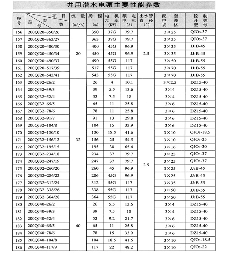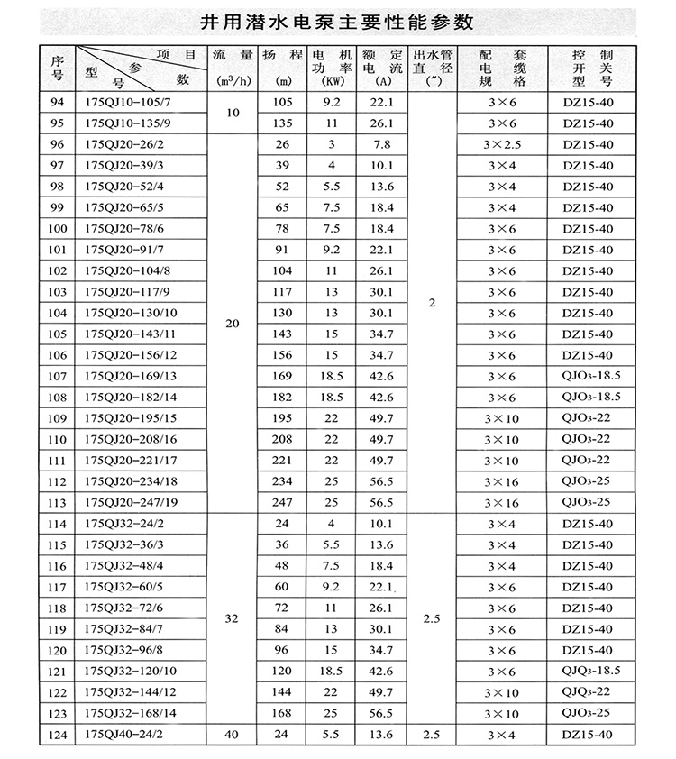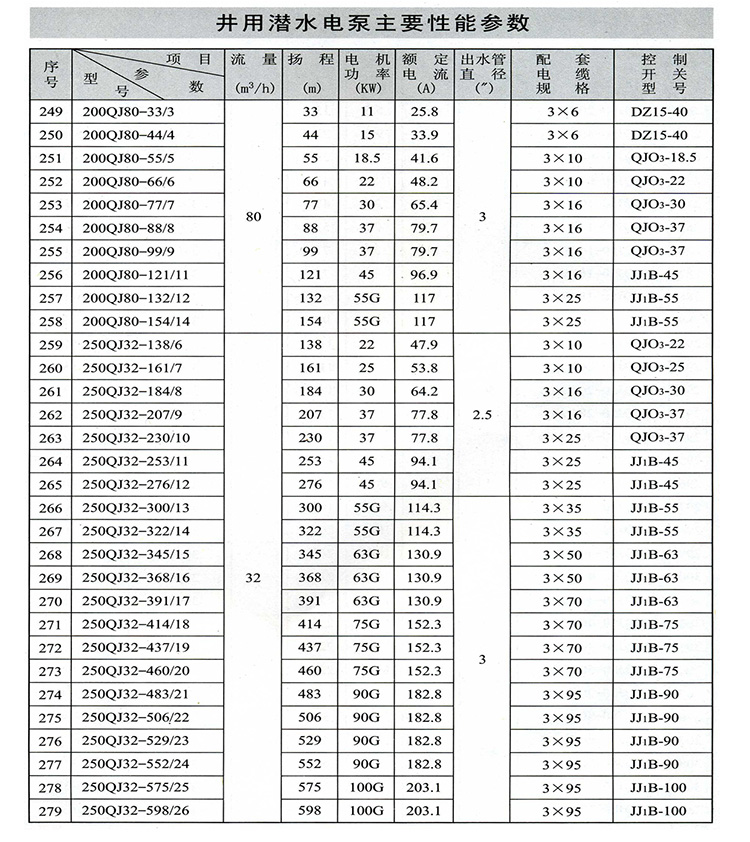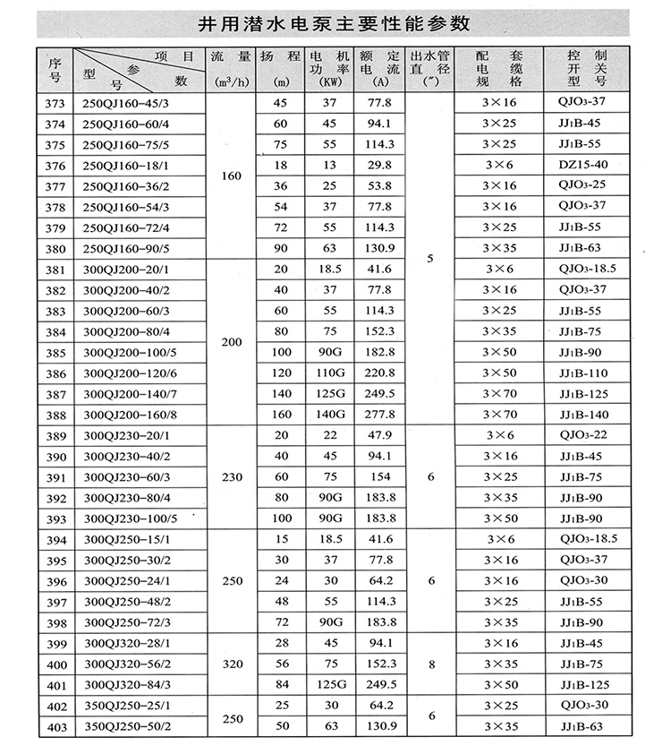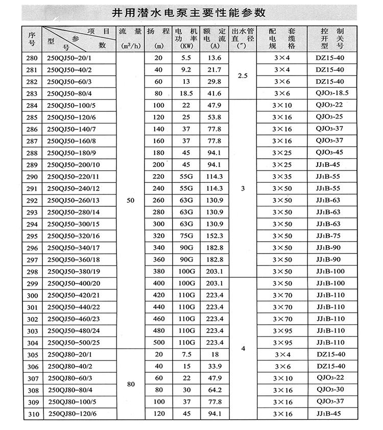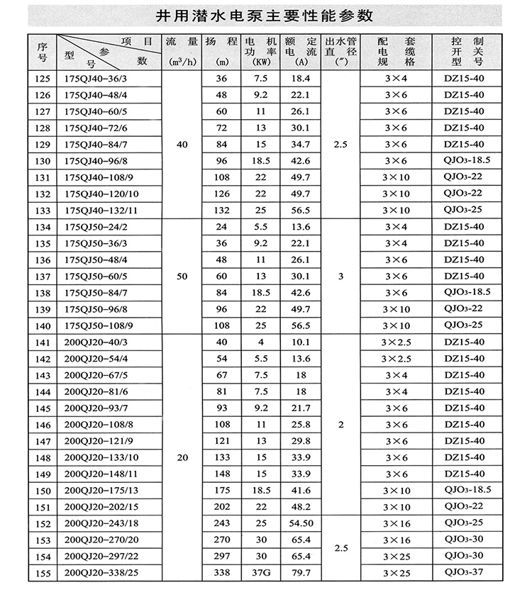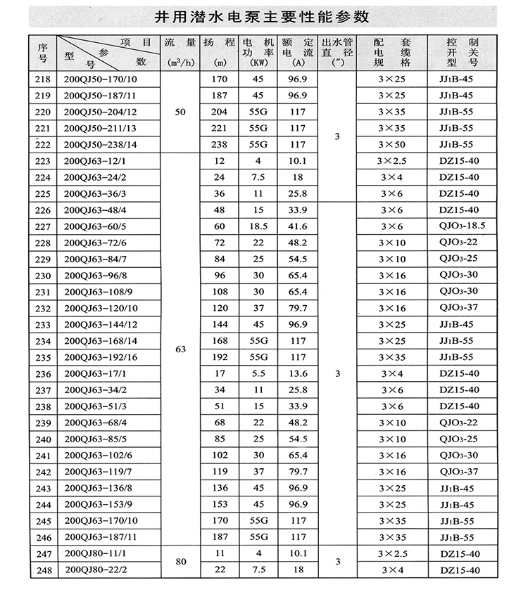 結構說明 1.QJ型潛水電泵機組由:水泵、潛水電機(包括電纜)、輸水管和控制開關四大部分組成。潛水泵為單吸多級立式離心泵:潛水電機為密閉充水濕式、立式三相鼠籠異歩電動機,電機與水泵通過爪式或中.鍵筒式聯軸器直接;配備有不同規格的三芯電纜:起動設備為不同容量等級的空氣開關和自耦減壓起動器、輸水管為不同直徑的鋼管制成,采用法蘭聯接,高揚程電泵釆用閘閥控制。 2.潛水泵每級導流殼中裝有一個橡膠軸承;葉輪用錐形套固定在泵軸上:導流殼采用嫘紋或螺栓聯成一體。 3.高揚程潛水泵上部裝有止回閥,避免停機水錘造成機組破壞。 4.潛水電機軸上部裝有迷宮式防砂器和兩個反向裝配的骨架油封,防止流砂進入電機。 5.潛水電機采用水潤滑軸承,下部裝有橡膠調壓膜、調壓彈簧,組成調壓室,調節由于溫度引起的壓力變化;電機繞組采用聚乙烯絕緣,尼龍護套耐水電磁線,電纜聯接方式按QJ型電纜接頭工藝, 把接頭絕緣脫去刮凈漆層,分別接好,焊接牢固,用生橡膠繞-層。再用防水粘膠帶纏2~3層,外面包上2〜3層防水膠布或用水膠粘結包一層橡膠帶(自行車里胎〉以防滲水。 6.電機密閉,采用精密止口螺牷,電纜出口加膠塾進行密封。 7.電機上端有一個注水孔,有一個放氣孔,卜部打個放水孔。 8.電機下部裝有上卜—止推軸承,止推軸承上有溝槽用干冷卻,和它對磨的是不銹鋼推力盤,承愛水泵的上廠軸向力。