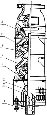 2、潛水泵每級導流殼中裝有一個橡膠軸承;葉輪用錐形套固定在泵軸上;導流殼采用螺紋或螺栓聯成一體。