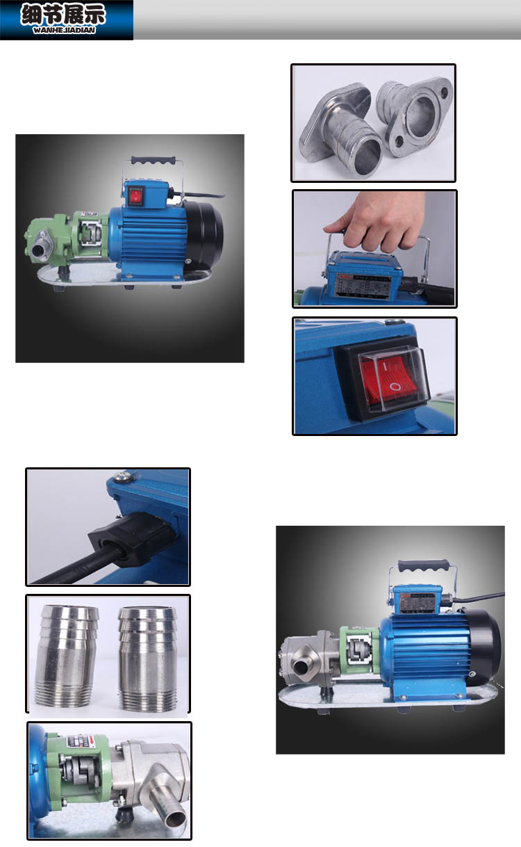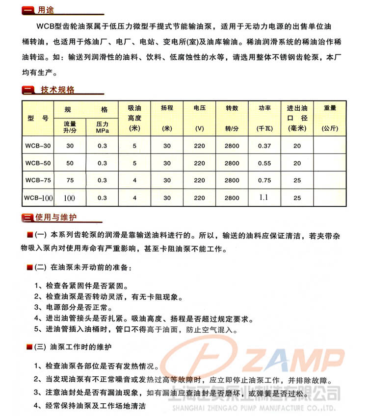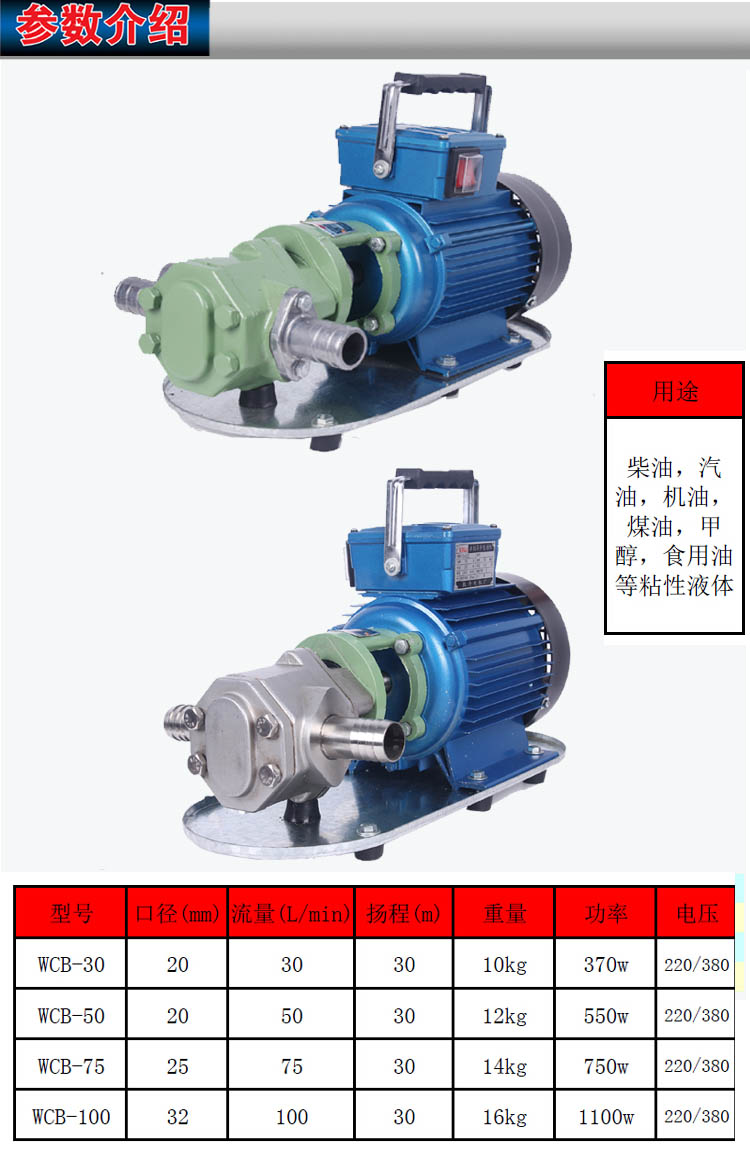 WCB型齒輪油泵屬于低壓力微型手提式輸油泵,適用于無動力電源的出售單位油桶車轉油,也適用于煉油、電、變電所(室)及油庫輸油。稀油潤滑系統的稀油治作稀油轉運。如:輸送無潤滑性的油料、飲料、低腐蝕性的水等,請選用整體不銹鋼齒輪泵,本均有生產。