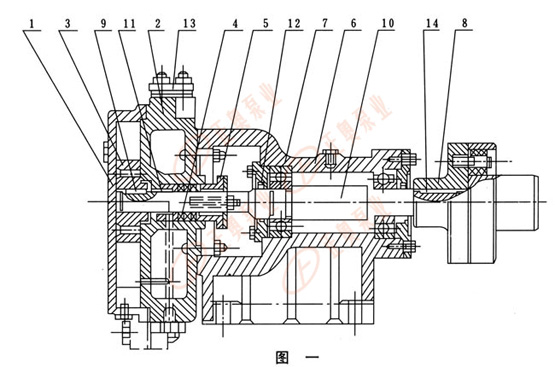 由鑄鐵制成葉輪(3),有l2個葉片呈放射狀均分布,有平衡孔(其中兩個套扣供拆卸用)平軸向力。口十輪平鍵(9)與軸(10)聯接并可沿軸向滑動調節間隙。軸為優質鋼制成,支承在泵的托架(6)內的兩個滾珠軸承(17)上右端有彈性聯軸器(8)和電機直接聯接。托架(6)用鑄鐵制成,有止口保證與泵體準確聯接,軸承間有空腔,可存潤滑油,用稀油或黃油滑均可。
