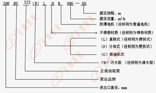 200-泵吸入口徑(mm) BYXZXW-正奧牌強自吸排污泵 (沒標W則為清水型)L-直連式、F-分體式、C-柴油機式(沒標則為便拆式)BC-便拆裝式、H-不銹鋼材質(沒標則為鑄鐵材質)B-防爆電機(沒標則為普通電機)300-額定流量(m3/h)30-額定揚程(m)