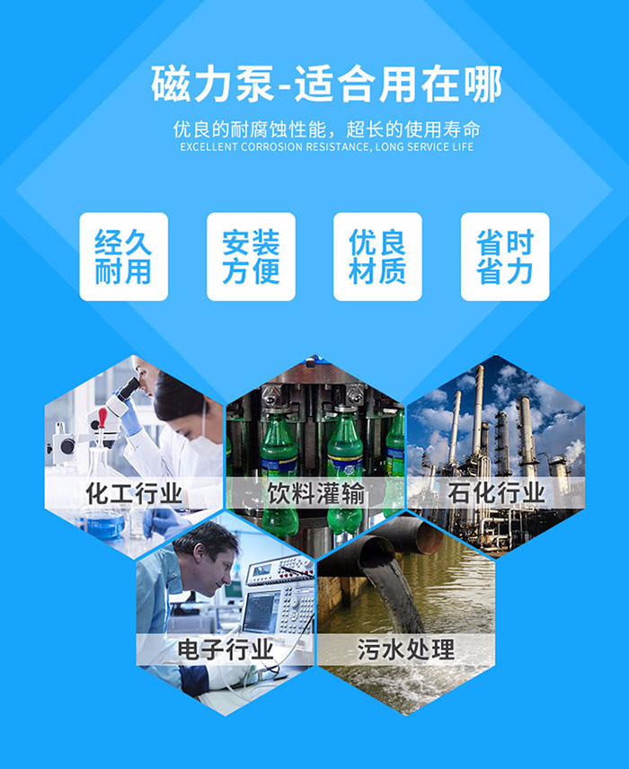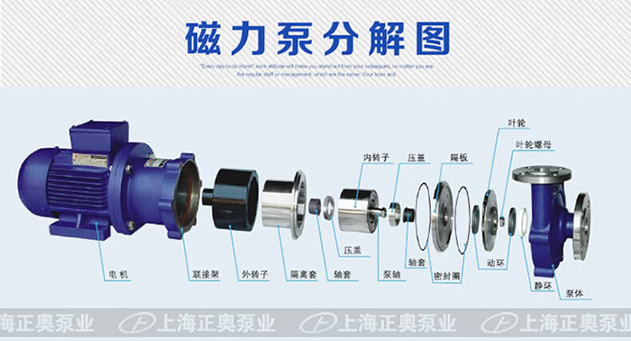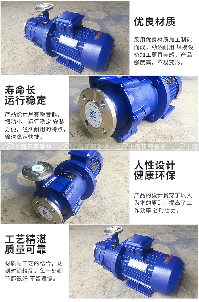 不銹鋼磁力泵以靜密封取代動密封,使泵的過流部件處于完全密封狀態,解決了其他泵機械密封無法避免的跑、冒、滴之弊病。磁力泵選用耐腐蝕、高強度的工程塑料、鋼玉陶瓷、不銹鋼等作為制造材料,因此它具有良好的抗腐蝕性能,并可以使被輸送介質免受污染。