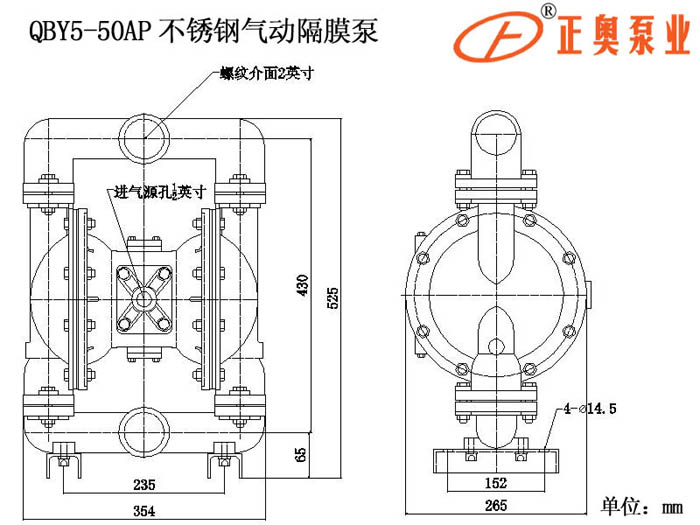 產品名稱:QBY5-50AP型不銹鋼螺紋氣動隔膜泵【全新五代氣動隔膜泵】