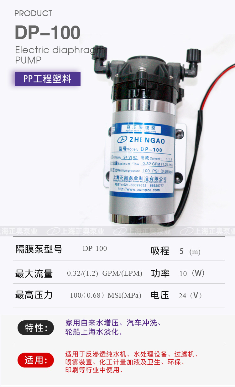 DP微型電動隔膜泵適用于家用自來水增壓、汽車沖洗、輪船上海水淡化,DP隔膜泵適用于反滲透純水機、水處理設備、過濾機、噴霧裝置、化工計量加液及衛生、環保、印刷等行業中使用。