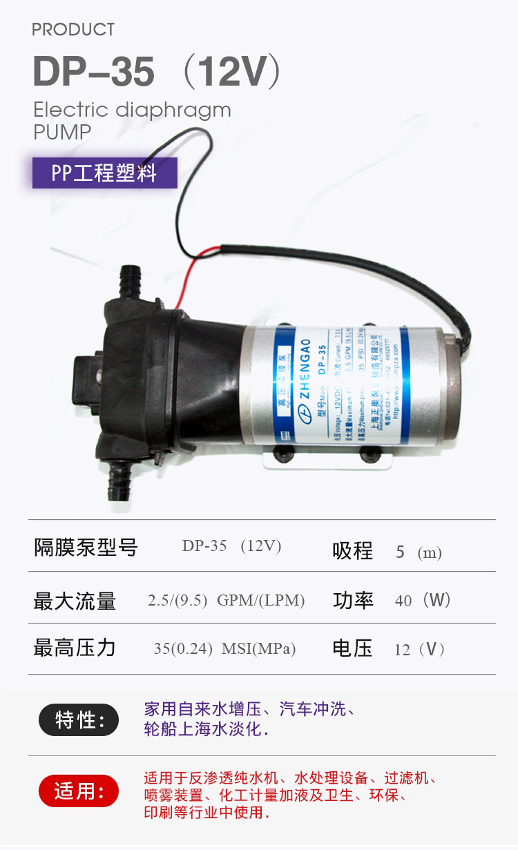 DP微型電動隔膜泵適用于家用自來水增壓、汽車沖洗、輪船上海水淡化,DP隔膜泵適用于反滲透純水機、水處理設備、過濾機、噴霧裝置、化工計量加液及衛生、環保、印刷等行業中使用。