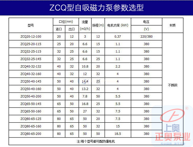 ZCQ型自吸式磁力泵性能參數表