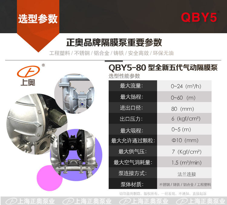 QBY5-80F型塑料氣動隔膜泵是我公司開發(fā)的第五代氣動隔膜泵,QBY5型正奧氣動隔膜泵是上海正奧泵業(yè)有限公司氣動隔膜泵的外形進(jìn)一步改進(jìn),機(jī)械外觀更美;不卡機(jī),無油氣動隔膜泵。