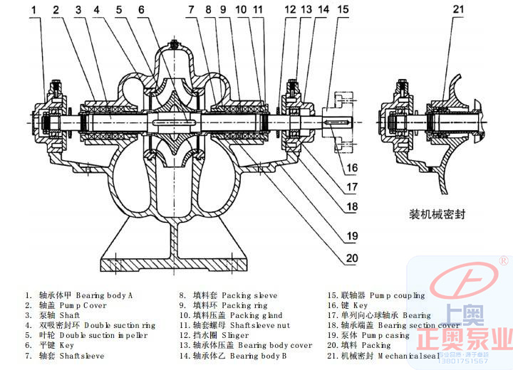 泵主要零件有:泵體、泵蓋、葉輪、軸、雙吸密封環、軸套等。
