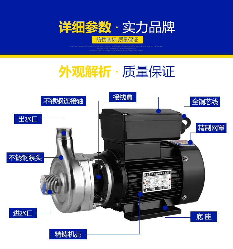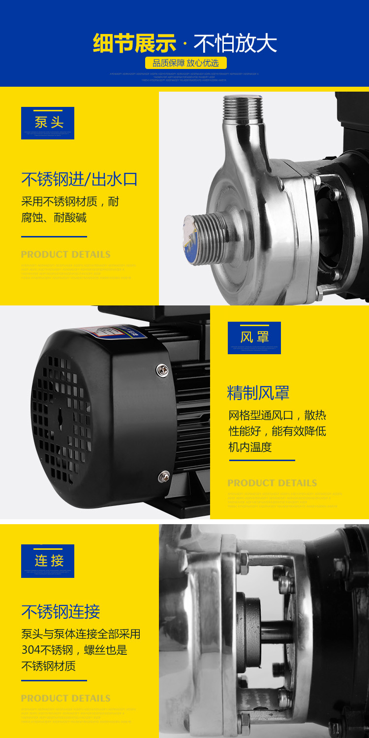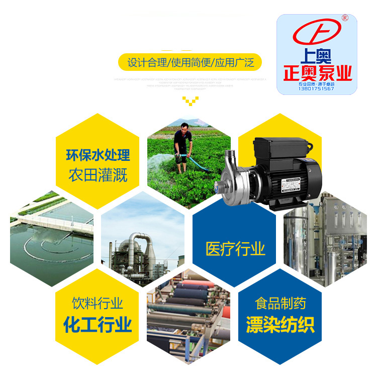 不銹鋼離心式耐腐蝕微型電泵可輸送溫度不高于103℃,含有細小軟顆;蚶w維質,帶腐蝕性或有衛生要求的液體,廣泛適用于食品、飲料、醫藥、污水處理、化工、電鍍、漂染、精細化工等行業使用。