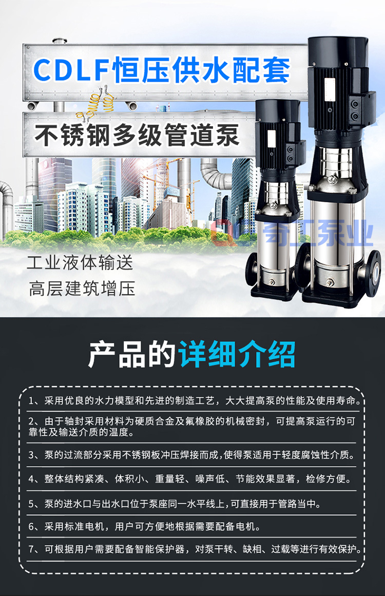 CDL/CDLF輕型不銹鋼立式多級泵是一種多功能產品,可以輸送從自來水到工業液體的各種不同介質,適應于不同溫度、流量和壓力范圍,CDL適用于無腐蝕性液體,CDLF適用于輕度腐蝕性液體。泵的過流部分均采用不銹鋼(304\316)材料制成,可適用于輕度腐蝕性介質。該產品可替代國外CR、CRN等同類產品。產品投放市場后,以其高效節能、質量可靠、使用范圍廣等特點,深受廣大用戶的喜愛。