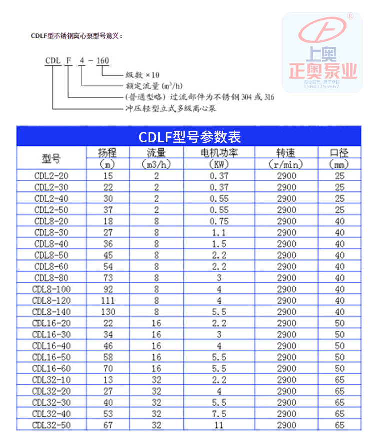 CDLF輕型不銹鋼立式多級泵性能參數: