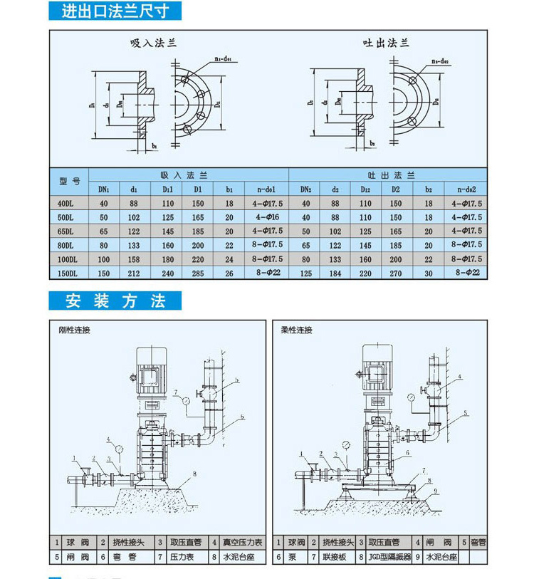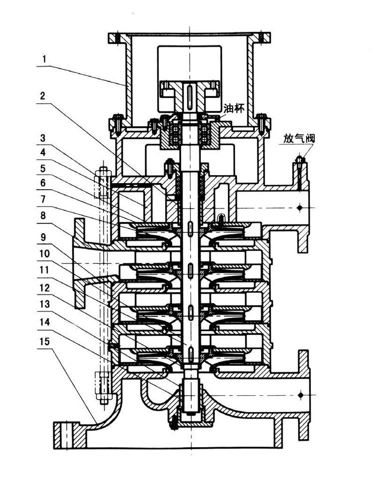 DL立式多級離心泵為立式多級多節段式結構。螺桿把進水段、中段、出水段夾緊聯成一體。水泵每一級 裝一個葉輪、一個導水葉。軸向力采用水力平衡法解決,殘余軸向力由球軸軸承承受,用油脂潤滑。軸封采用軟填料或機械密封。產品執行JB/T2727-93 《立式多級離心泵型式與基本參數》標準,主要供吸送稀釋的、清潔的、不腐蝕的、不爆炸的清水及物理化學性質類似水的不含固體顆;蚶w維的液體。