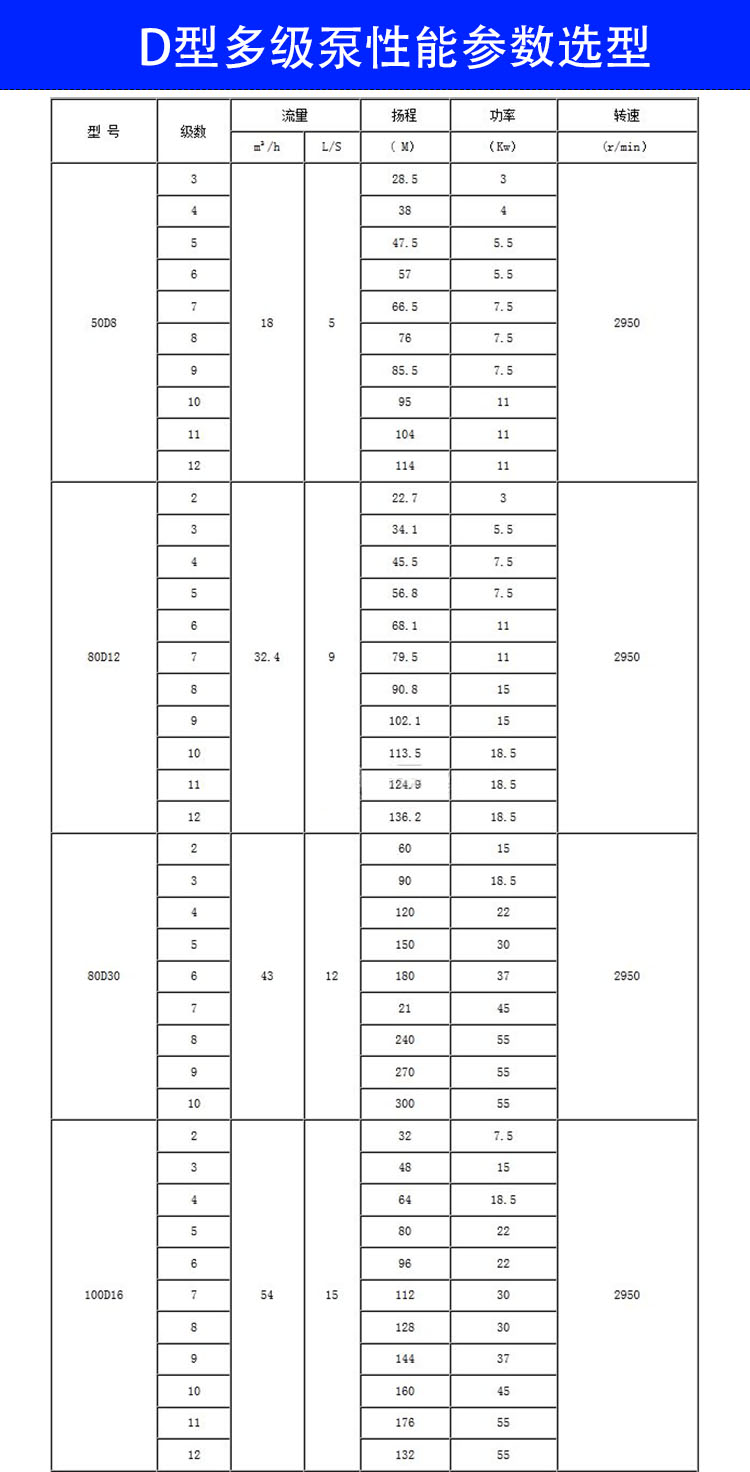 本司D型臥式多級離心泵D型臥式、單吸多級、分段式離心泵。具有效率高、性能范圍廣、運行安全平穩、噪音低、壽命長、安裝維修方便等特點。供輸送清水或物理化學性質類似于水的其它液體。也可以通過改變泵過流部件材質、密封形式和增加冷卻系統用于輸送熱水、油類、腐蝕性或含磨粒的介質。產品執行JB/T1051-93《多級
